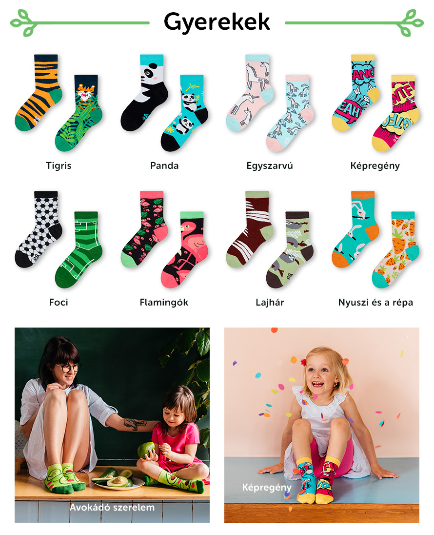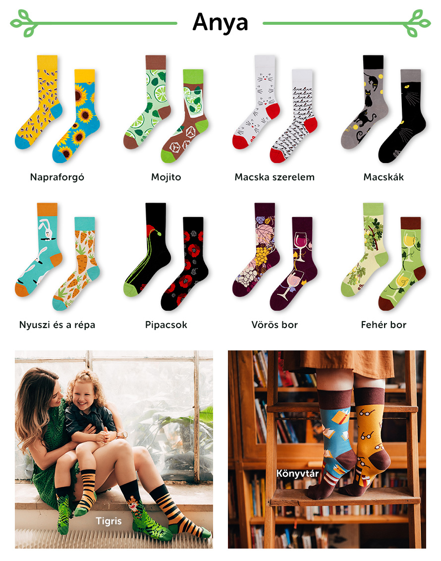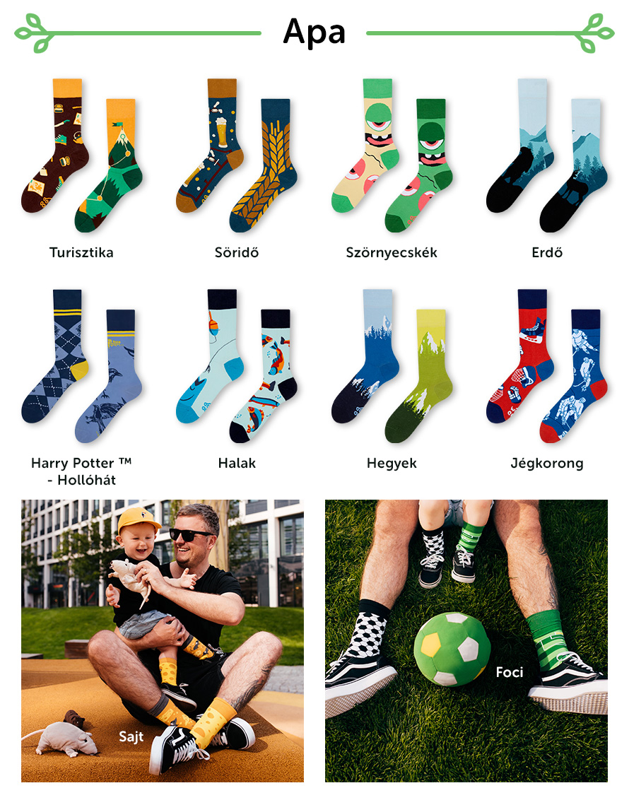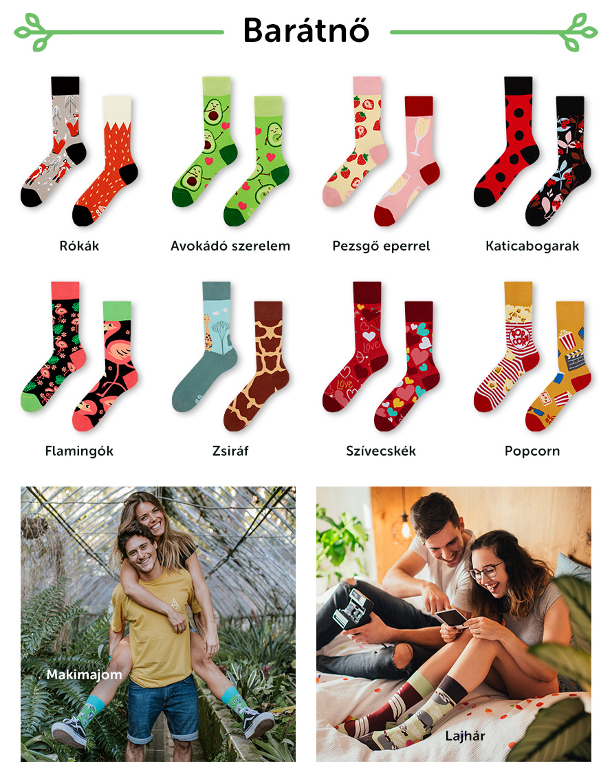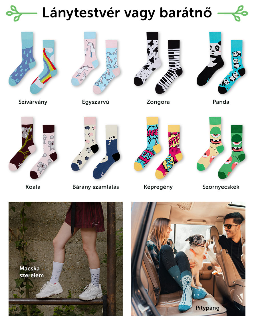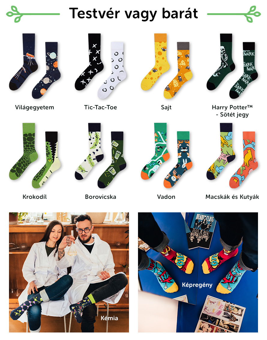 Nálunk mindig találtok olyan darabot, mely a legválogatósabb személynek is tetszeni fog. Már most örülhettek a barátotok vagy a családtagotok csillogó szemeinek, aki a karácsonyfa alatt Vidám zoknit talál. Kínálatunkban több mint 150 dizájnú zoknit találtok, beleértve állatos, ételes, hobbis vagy akár Harry Potteres dizájnnal. Válasszatok már ma!